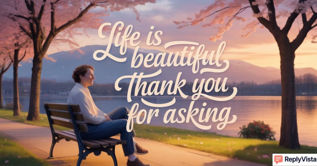 A funny reply uses light humor to deflect or bond. Good examples include: “Still breathing!”, “Living the dream… one alarm clock at a time,” or “Ask my therapist.” It’s perfect for friends who get your humor.